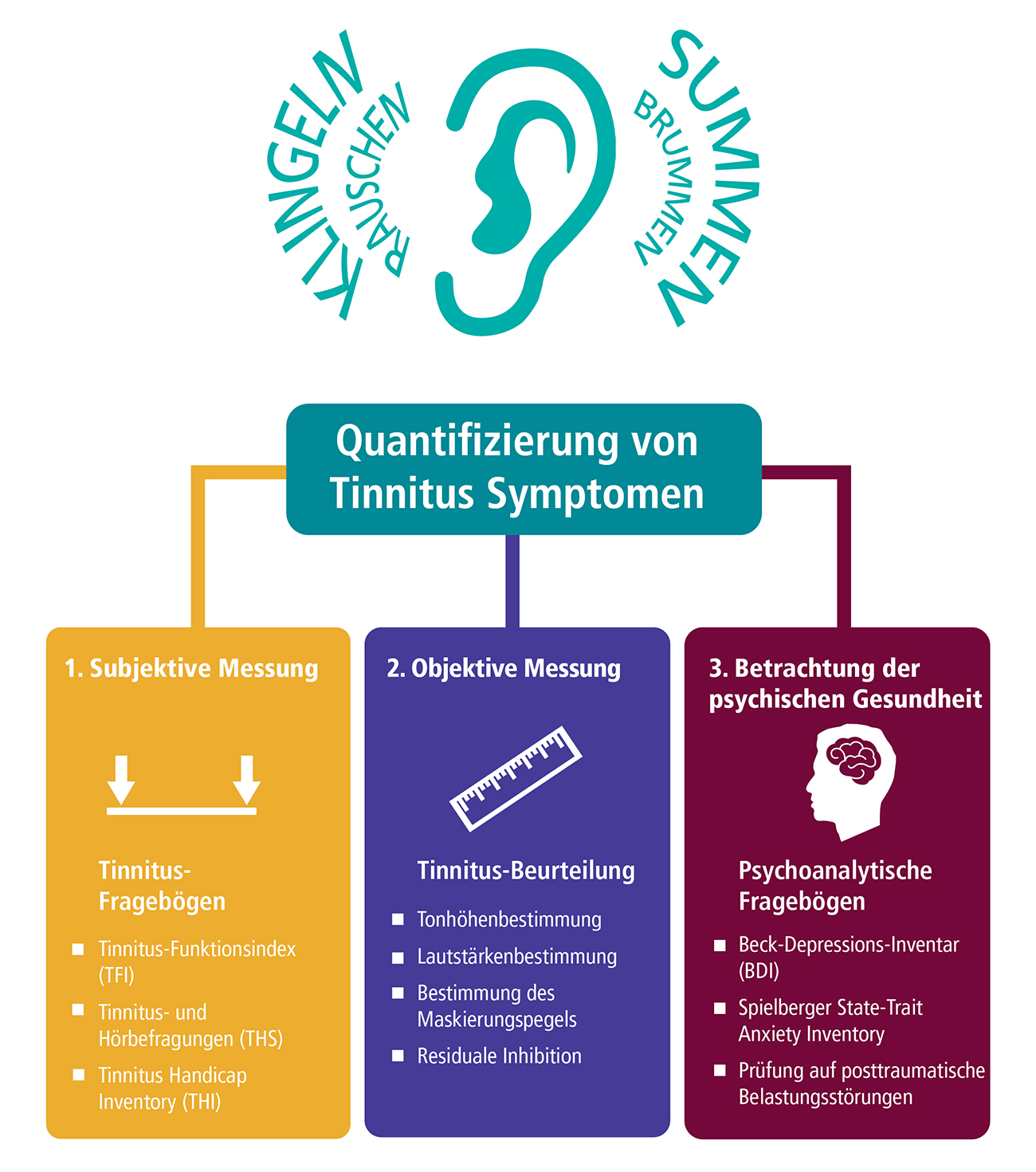 Eine spezifische Untersuchung auf Tinnitus im Anschluss an die ursprüngliche Bewertung des Hörvermögens besteht aus subjektiven Messungen, objektiven Messungen und psychoanalytischen Fragebögen, welche die Tinnitus-Symptome quantifizieren und einen Einblick in die Auswirkungen dieser Symptome auf die Lebensqualität des Tinnitus-Patienten geben. Mithilfe dieses Schrittes kann der Hörakustiker oder Audiologe außerdem den Tinnitus klassifizieren: subjektiver vs. objektiver (pulssynchroner) Tinnitus, primärer vs. sekundärer Tinnitus, akuter vs. chronischer Tinnitus und störender vs. nicht störender Tinnitus.