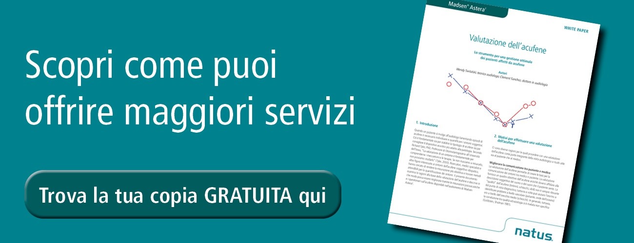 Una valutazione completa degli acufeni offre a te e al tuo paziente molti vantaggi, tra cui migliori strategie di comunicazione, la rassicurazione del paziente confermando l’esistenza del disagio causato dall’acufene, così come una base per il trattamento. Scopri gli strumenti di valutazione e di applicazione dell’acufene a tua disposizione per aiutare i tuoi pazienti a gestire i loro sintomi.